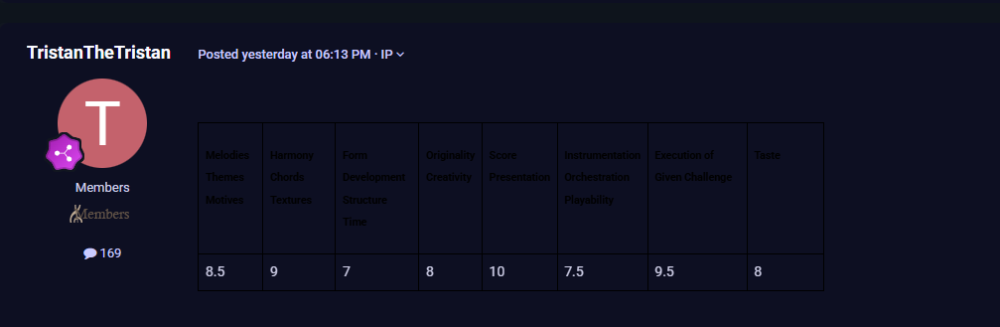 @TristanTheTristan As I am still getting accustomed to the site, I have taken it upon myself to get familiar with some of the other forums and type of music people have put on YCF. I have been interested to explore what people have to offer, and from my curiosity, I decided to also start giving feedback on scores submitted by people for this Halloween Competition. This said, to whomever I comment on, I will be treating them like a professional and write based on the expectation that they know, at minimum, intermediate music theory. For now, I will avoid making a table of my rating, however, please find the following to be my review of your submission. As a final note, I like to be straightforward with colleagues, and by no means am I coming from a place of bad faith. I want to push my peers to new heights, and I will be honest with them so they know the truth and can evolve from there. __________ While fitting the criteria of the competition, I do not see this piece as a practical work made for performance. I have noticed multiple errors where a professional concert pianist would have a high level of difficulty playing this work; specifically "Variation 4" where you employ single note tremelos. However, they are not uncommon to use as Liszt, and Debussy used them in their music. Liszt in the Friska from "Hungarian Rhapsody no. 2" and Debussy from the Prelude "...Ce qu'a vu le vent d'ouest". In comparison, your usage of them is more difficult due to the amount of note shifts a pianist will have to do, versus the raw technique. In a similar mindset, I do not believe the first section from measures 1-40 to be realistically playable on the piano. Continuing on, the engraving for the score concerns me heavily. The measures seem to be too small or placed too closely together throughout and in spots, like measure 128, you have two different spellings for the same note (G# and Ab). Musically, is it rather interesting and I did enjoy the theme you created. I love to write in D-minor when given the chance, and I was vibing with the "sinister" nature the key provides in your theme. If you would like to talk more or explore these comments, I would not mind doing so. Thank you for taking the time to read this 🙂