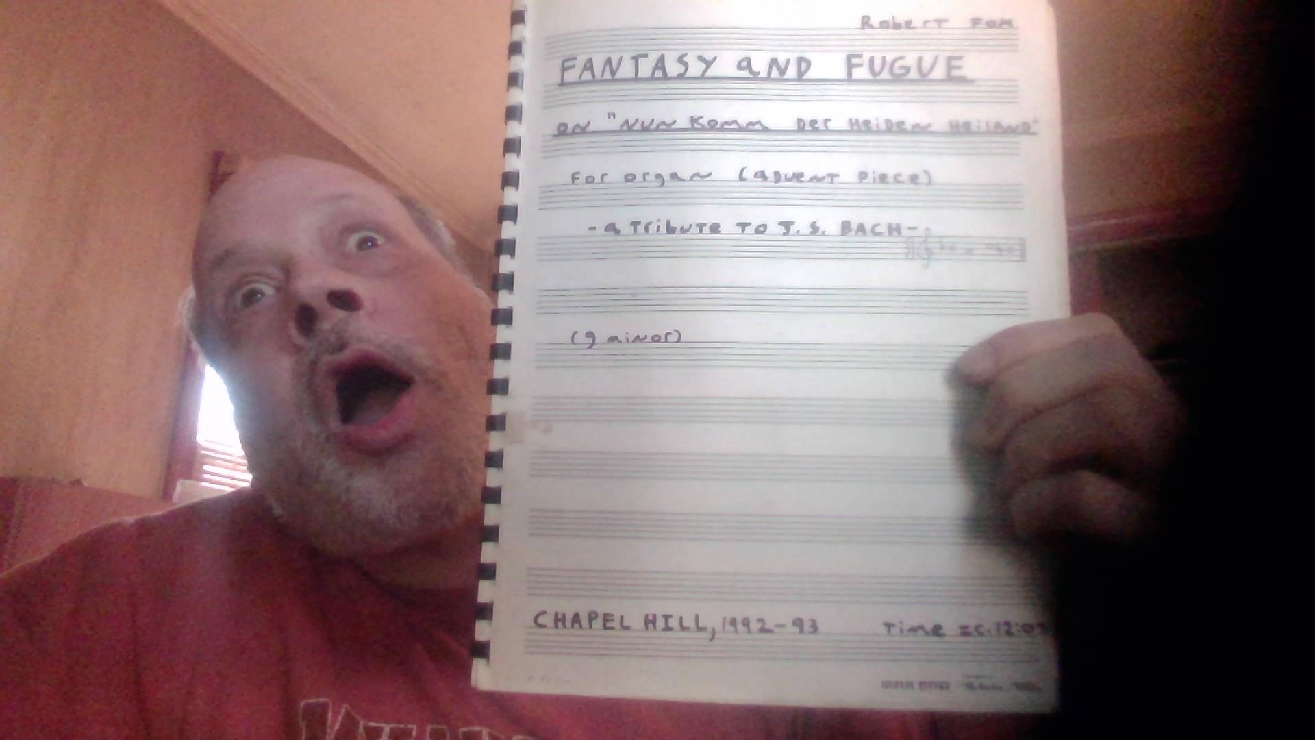 Just for fun, this piece is very amusing. 1992, grad school, trying to be "complex" and impress people. Poor course of action. There is also a (atonal) fugue, and it is a fifteen-page beast. I pretentiously use the "B-A-C-H" motive...maybe I will put it in, because the ending is at least spectacular! Like Mozart being asked if he liked an orchestra's famous "first note" and replying something like: "Yes, but I liked the last note better." Fantasy And Fugue For Organ-Fantasy Free Sheet Music by Robert C. Fox for Organ | Noteflight I believe my organ writing changed a bit between 1992-3 and 2011 or so. Other than these pieces, only organ music I've written is mainly accompaniment to choral pieces.- Today