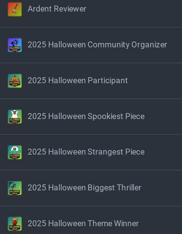 Vote for your favorites in this years Halloween Competition! Those who review everyone's entries will receive the "Ardent Reviewer" badge and everyone who participated by submitting music will receive the "2025 Halloween Participant" badge. Besides that, there will also be four winners: "2025 Halloween Spookiest Piece", "2025 Halloween Strangest Piece", "2025 Halloween Biggest Thriller" and "2025 Halloween Theme Winner".